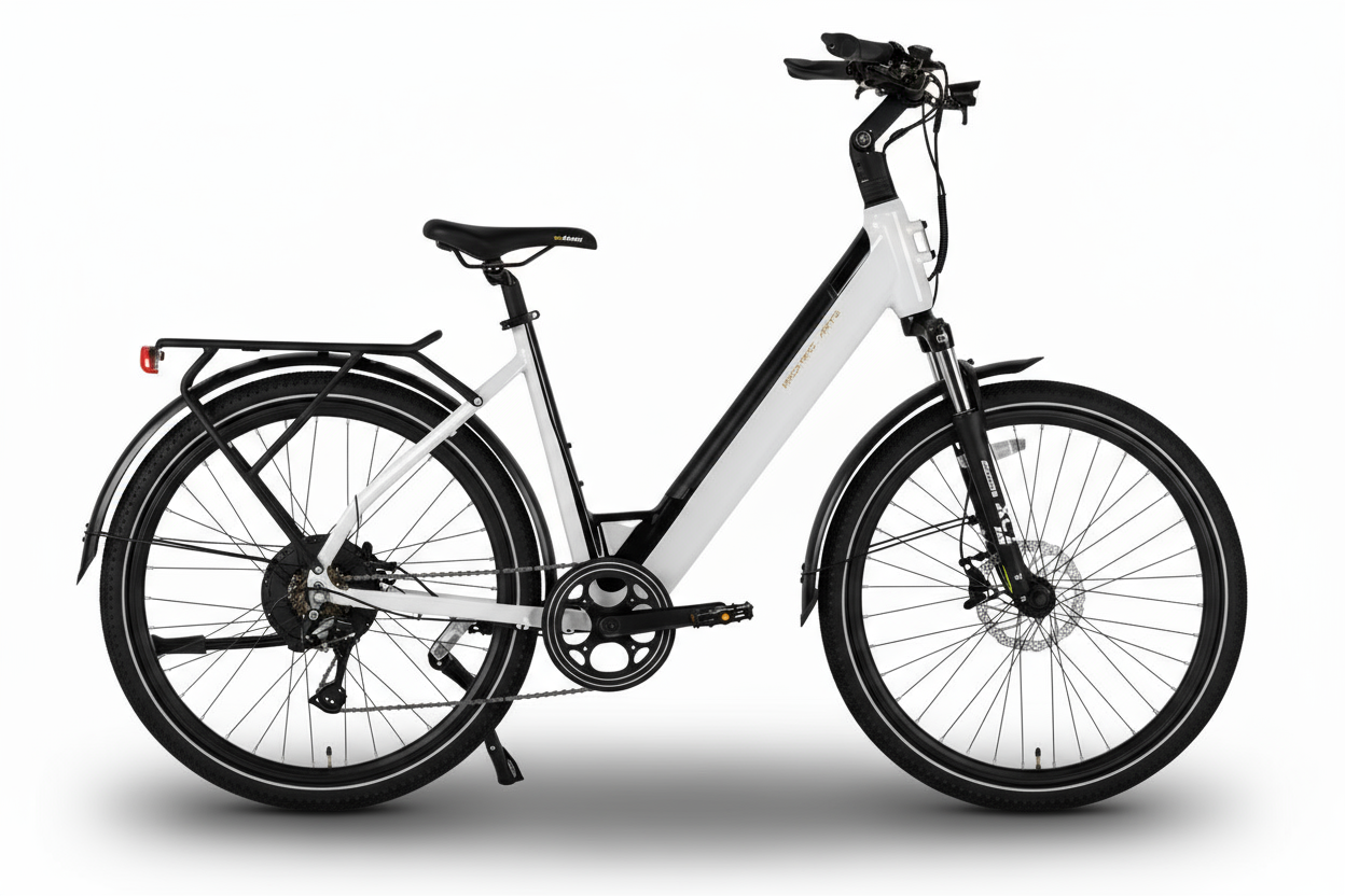 Pedaler, solid støtte, lys foran og bak (drevet av sykkelens batteri), solid bagasjebærer, heldekkende skjermer